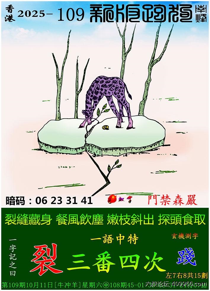 109期新版跑狗一字記之曰:【裂】 玄機測字:《踐》 一語中特:三番四次