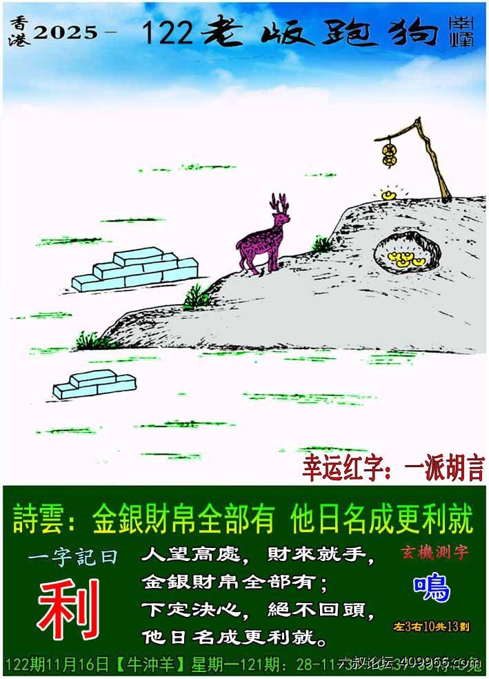 122期老版跑狗一字記之曰:【利】 詩雲:金銀財帛全部有,他日名成更利就。