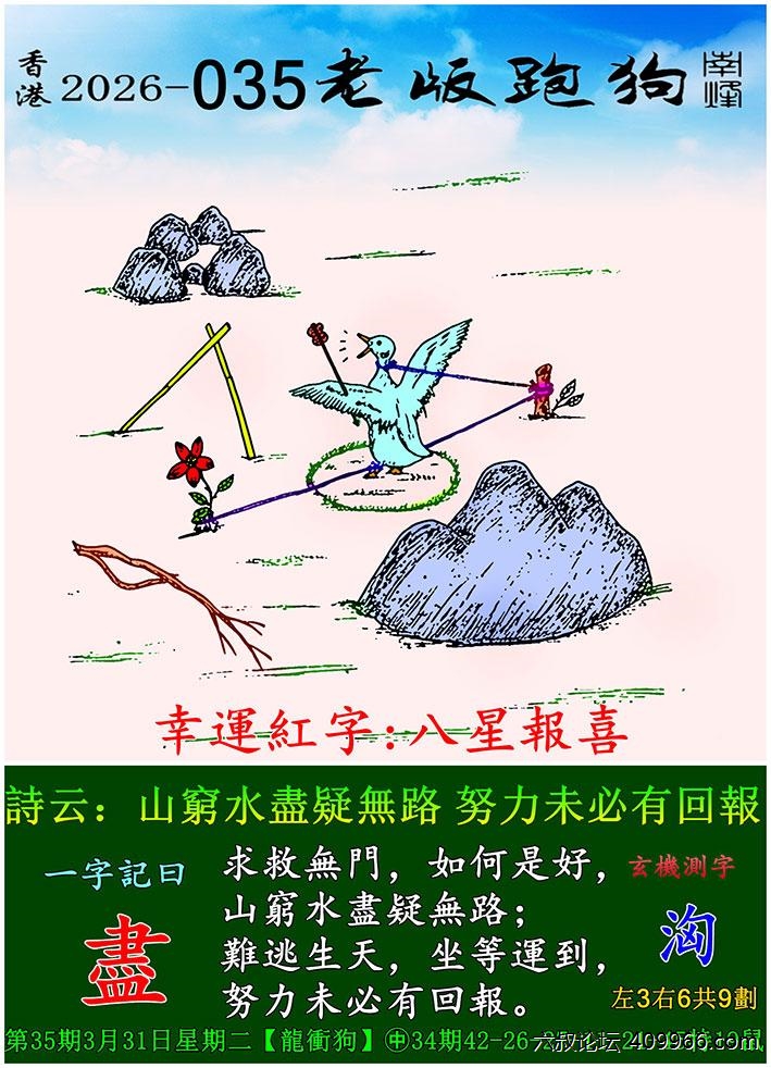 035期老版跑狗一字記之曰:【盡】 詩雲:山窮水盡疑無路,努力未必有回報。