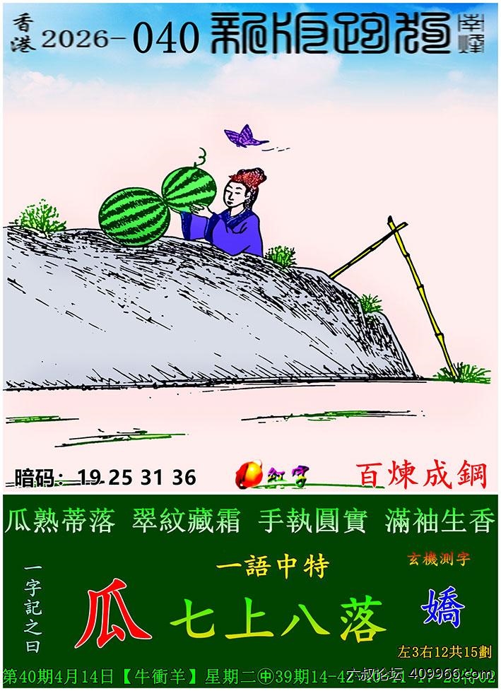 040期新版跑狗一字記之曰:【瓜】 玄機測字:《嬌》 一語中特:七上八落